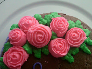 Today was my last Wilton Basics class! It was graduation day. First we learned a little more about preserving cakes, then how to write on a cake, and then the famous ribbon roses. The final class project was to have a cake design in mind and decorate one. I decided to add coco powder to the basic Wilton butter cream icing recipe. Everyone who tried it said it was 100x better than the plain vanilla.