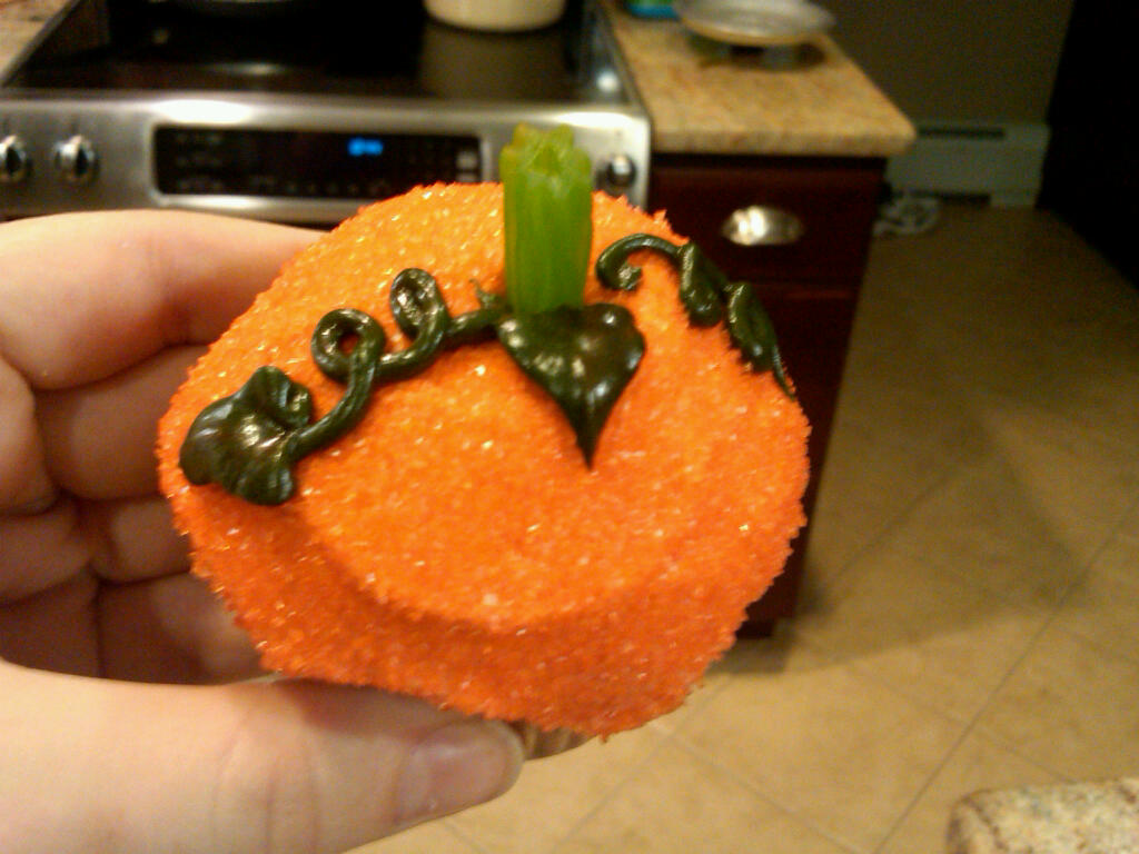 Pumpkin cupcakes: Orange Buttercream frosting rolled in orange crystallized sprinkles, a piece of green licorice for the stem and pipping gel tinted moss green made the vines.